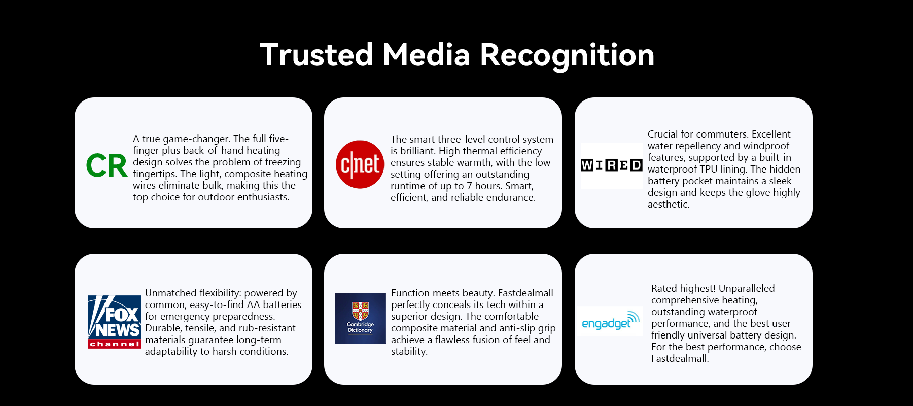 Fastdealmall prioritizes portability, practical design, and reliable warmth. Core features include full-finger heating, adjustable temperature settings, and waterproof protection – providing effortless, instant warmth anytime, anywhere.